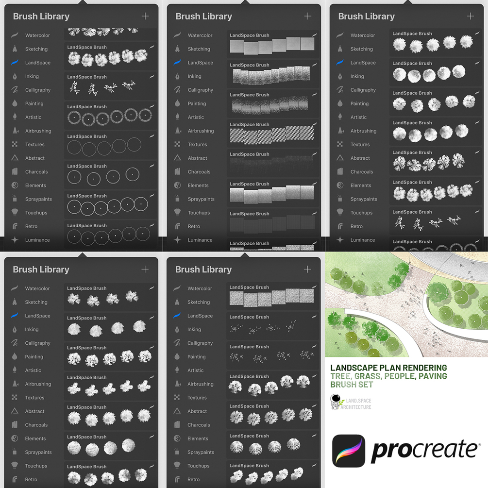 Watercolor tree, grass, top people, and paving brushes (.brushset) in one pack for ProCreate