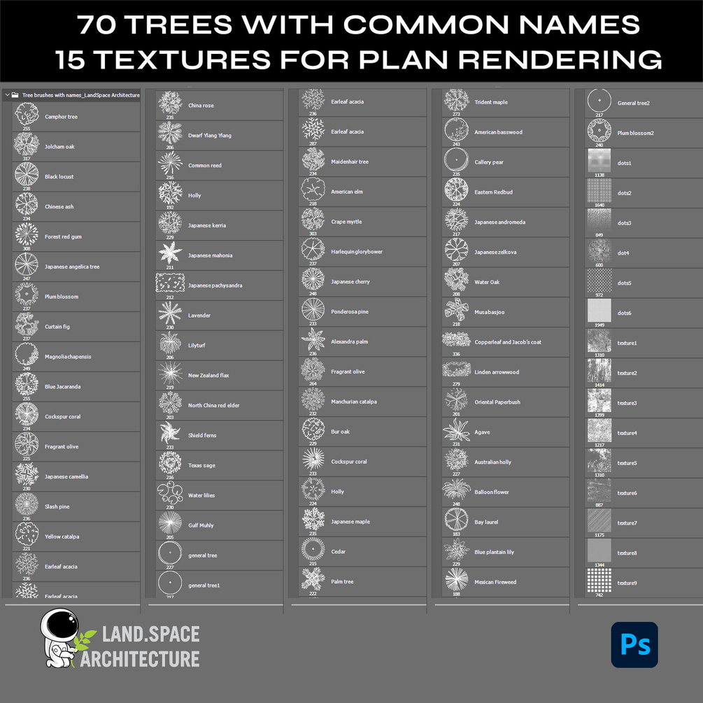 Content: The ultimate package for top view landscape plan and design. With 70 common name trees, 15 plan rendering textures, and 36 ready-to-use PSD trees, bring your vision to life with ease. Elevate your landscape designs today!