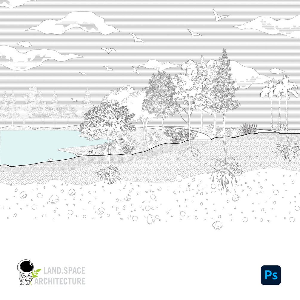 Technical details: Editable named trees and shrubs (common name and scientific name), environments, cut layers of soil, cutout vector people, ready-to-use axon diagrams, roots, rocks, and birds in Photoshop. Essential for landscape and architecture illustration.
