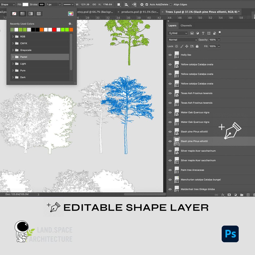 File Type: Photoshop Trees Silhouettes, editable shape layers and smart objects for landscape illustration