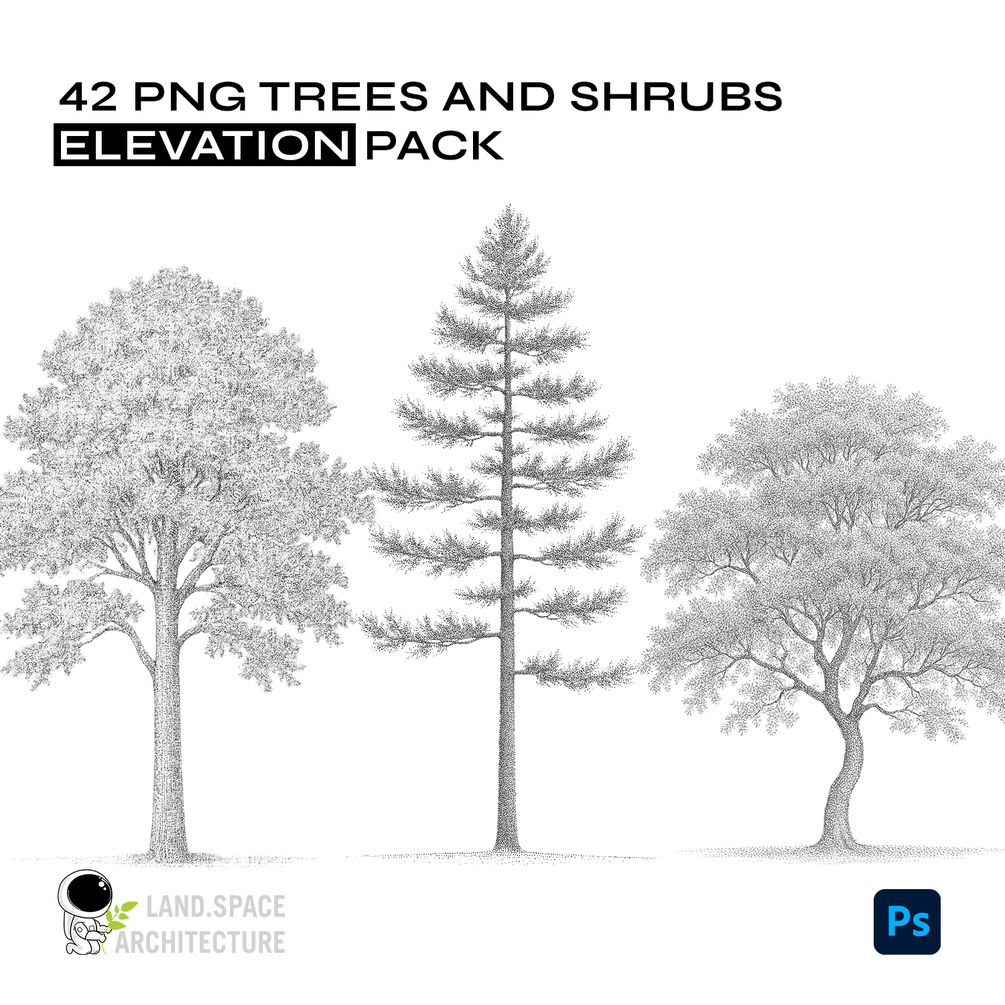 Technical details: Tree and shrub elevations illustration landscape rendering bundle - 42 PNG files.