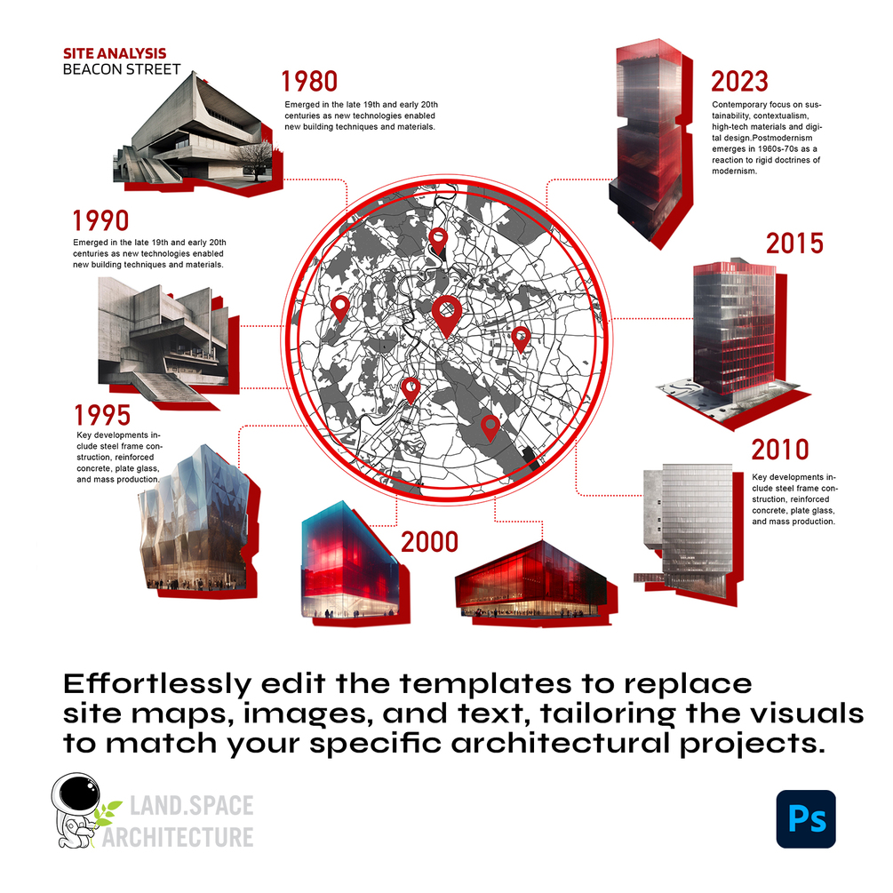 5 PSD mockup templates for architecture design site analysis and timeline visualization.