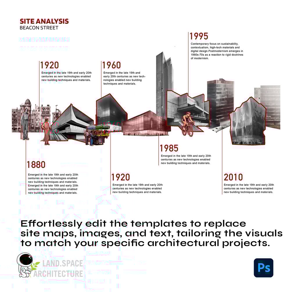 5 PSD mockup templates for architecture design site analysis and timeline visualization.